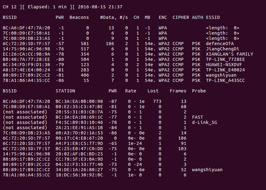 - STATION:客户端的 Mac 地址,包括连上的和想要连的客户端。如果客户端没有连上 AP,ESSID 列显示成 (not associated)。